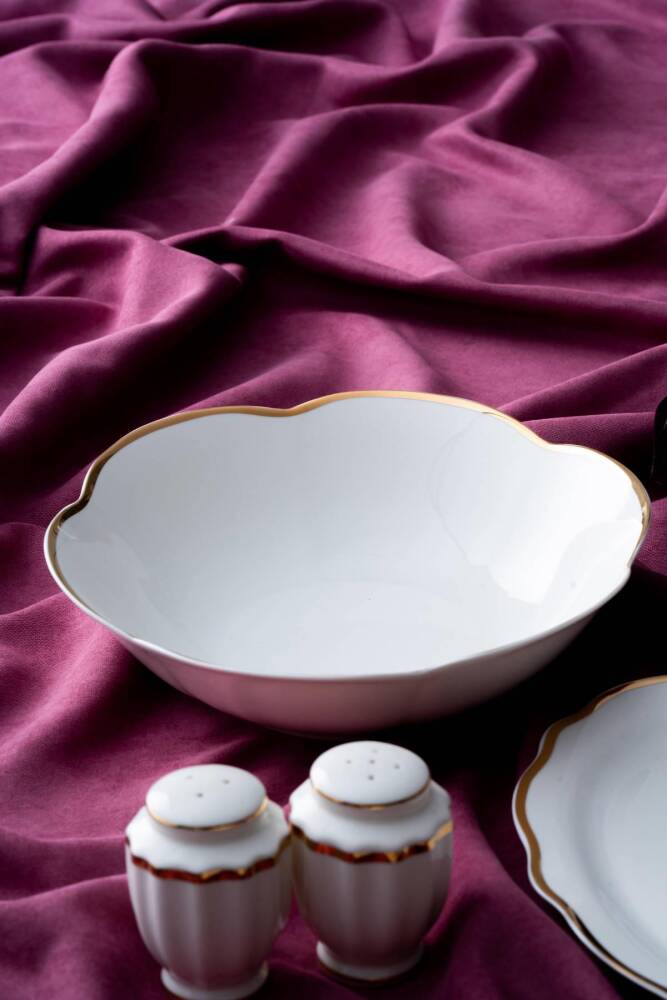 Acar Aveline porselen yemek takımı, modern gold renk detayları ile her türlü yemek sunumunuzu özel kılar. 6 kişilik set olarak sunulan bu 29 parçalık takım, geniş kullanım alanı ve dayanıklı porselen yapısıyla uzun yıllar güvenle kullanılır.