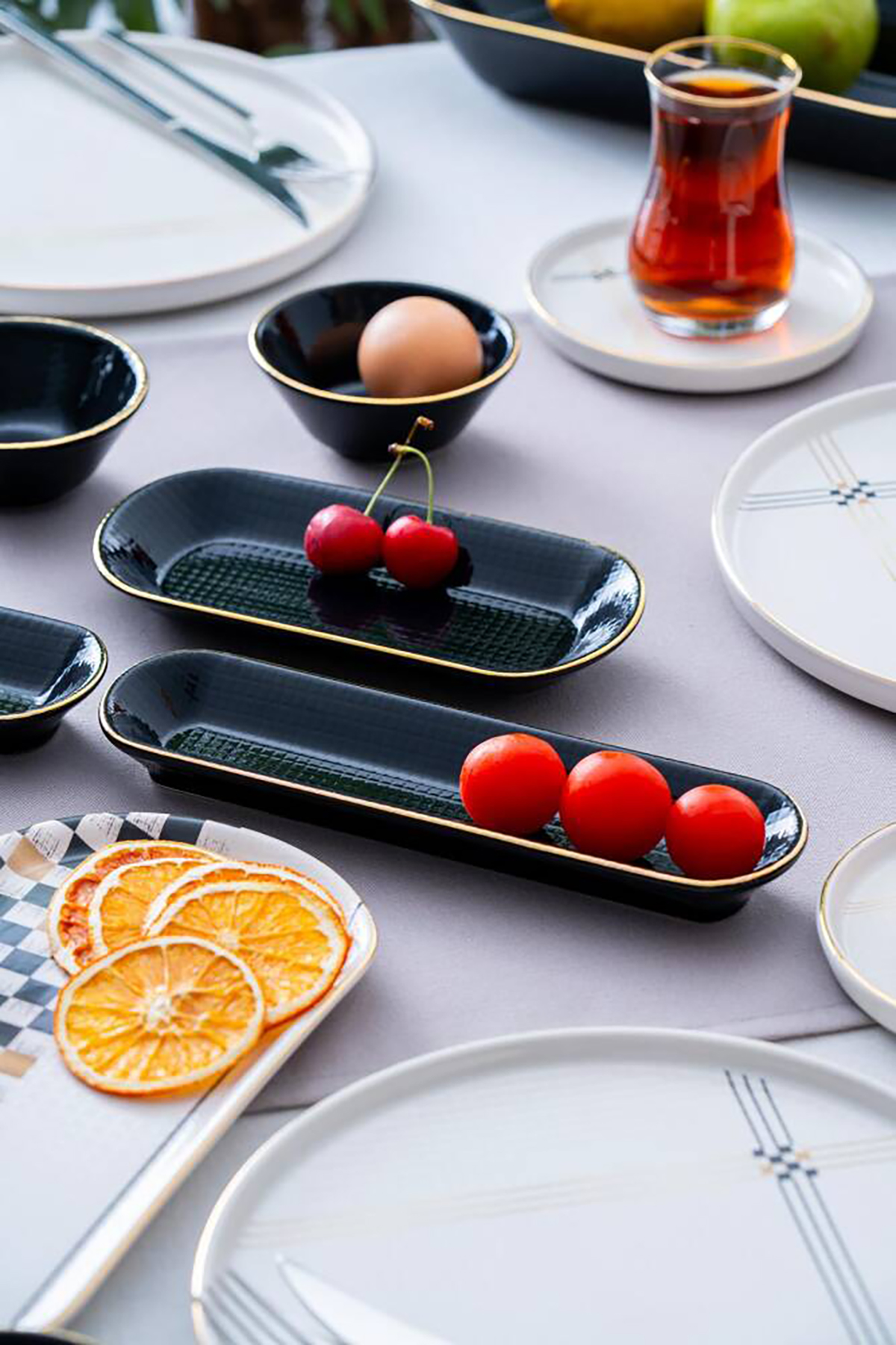 6 adet servis tabak: 23 cm 1 adet gondol kase: 29 x 15 x 5 cm 2 adet büyük kayık tabak: 27 x 13,5 cm 2 adet küçük kayık tabak: 19 x 9,5 x 2.5 cm 2 adet zeytinlik: 23 x 6 x 3 cm 6 adet reçellik: 10 x 4 cm 6 adet çay tabağı: 16 cm 6 adet çay bardağı