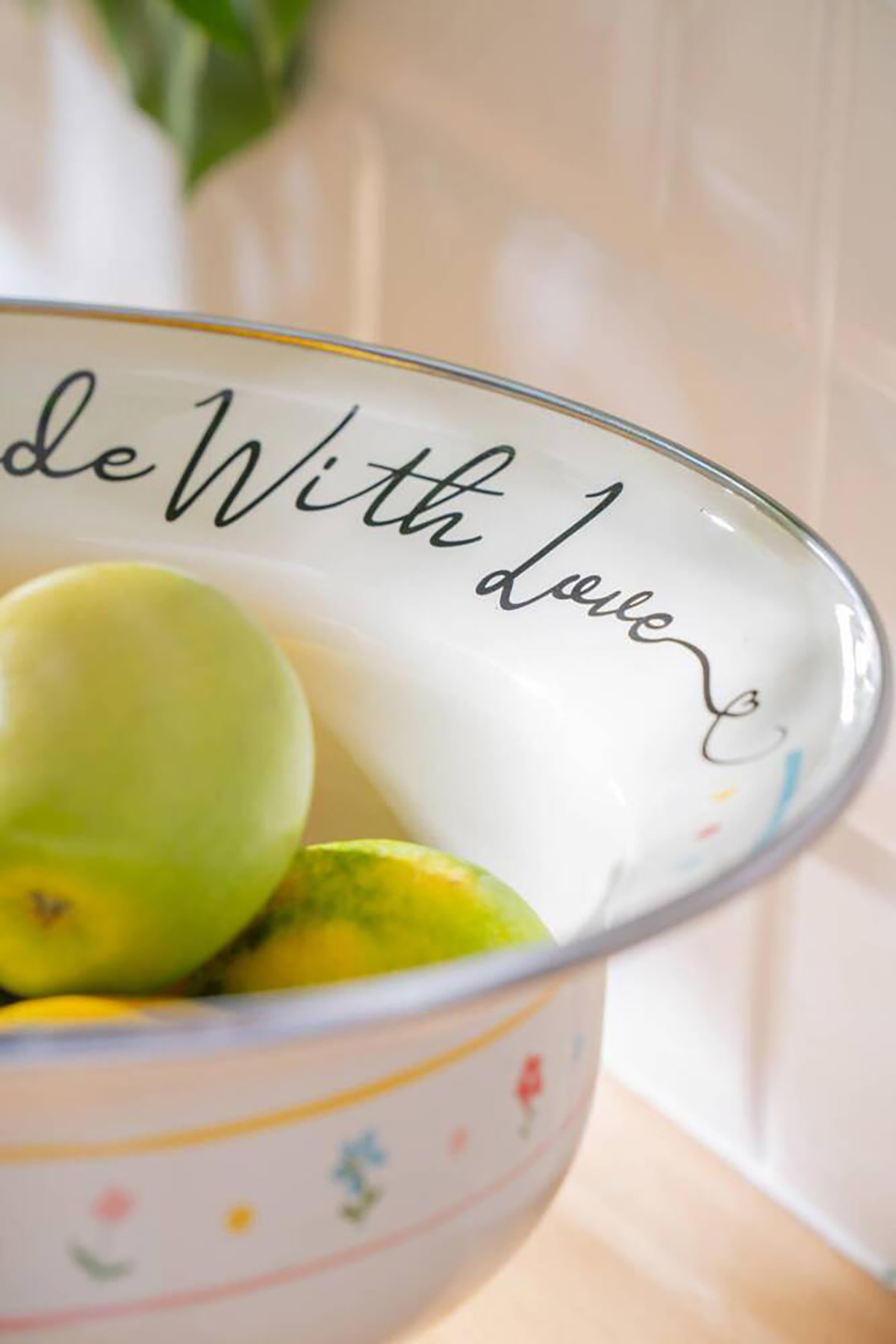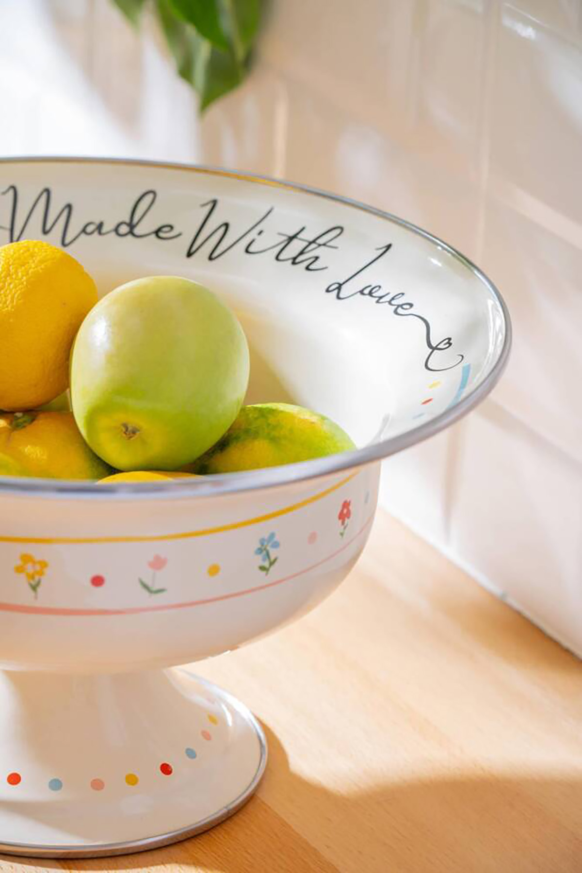 Dayanıklı emaye yüzeyi, leke ve koku tutmaz; kolay temizlenir ve uzun ömürlü kullanım sunar. Üzerindeki “Made With Love” yazılı detay, sunumlarınıza sıcak ve samimi bir dokunuş ekler. Hem fonksiyonel hem dekoratif bir ürün olan bu meyvelik, mutfağınızın ya da sofralarınızın sevilen parçası olmaya adaydır.
