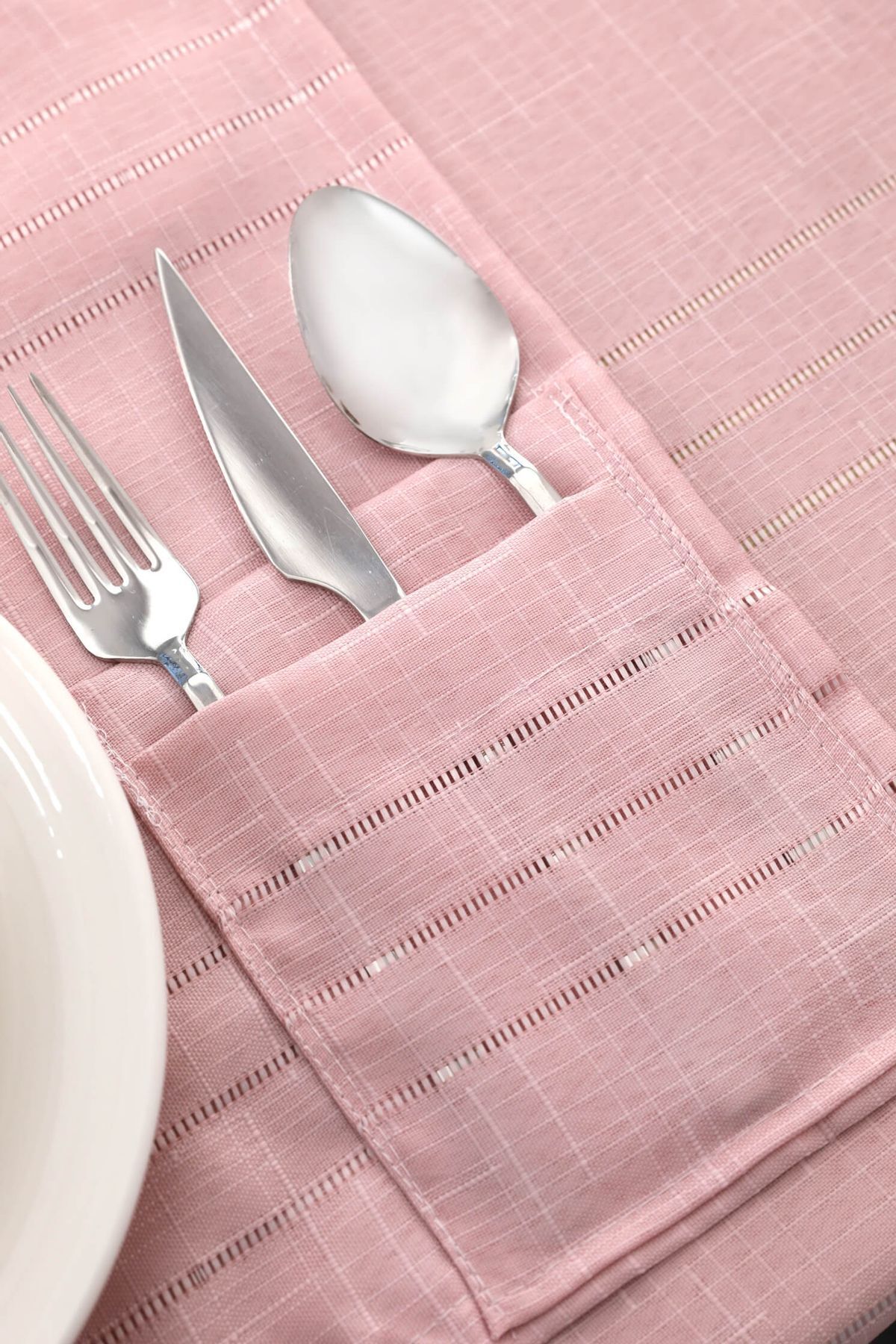 Çizgi detaylarıyla oldukça sade ve naif bir tasarıma sahip olan, 12 Kişilik Masa Örtüsü Runner Takımı sofralarınıza değer katacak. Her bir lokmayı ziyafete dönüştürecek bu takım ile ister özel günlerde masanıza hareket katın, isterseniz çeyizinizi süsleyin. Çatal, kaşık ve bıçakları bir arada tutacak ince düşünülmüş cep detayı sayesinde konforlu kullanım vadediyor.