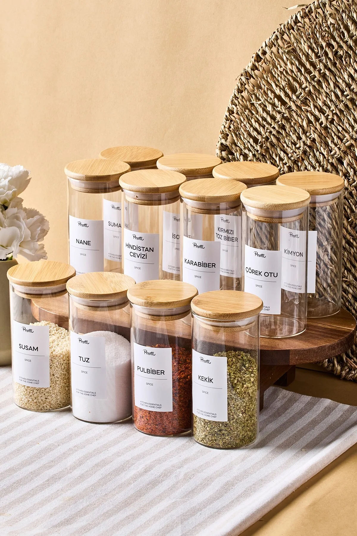 Mutfakta düzeni ve fonksiyonelliği bir arada sunan bu 12’li baharatlık seti, geniş hacmi ve modern tasarımıyla öne çıkar. Cam gövdesi sayesinde içerisindeki baharatları rahatça görebilir, kullanım sırasında zaman kaybetmeden ihtiyacınız olan ürüne kolayca ulaşabilirsiniz. Minimalist ve şık çizgileriyle tezgâh üstünde ya da raflarda estetik bir duruş sergiler.