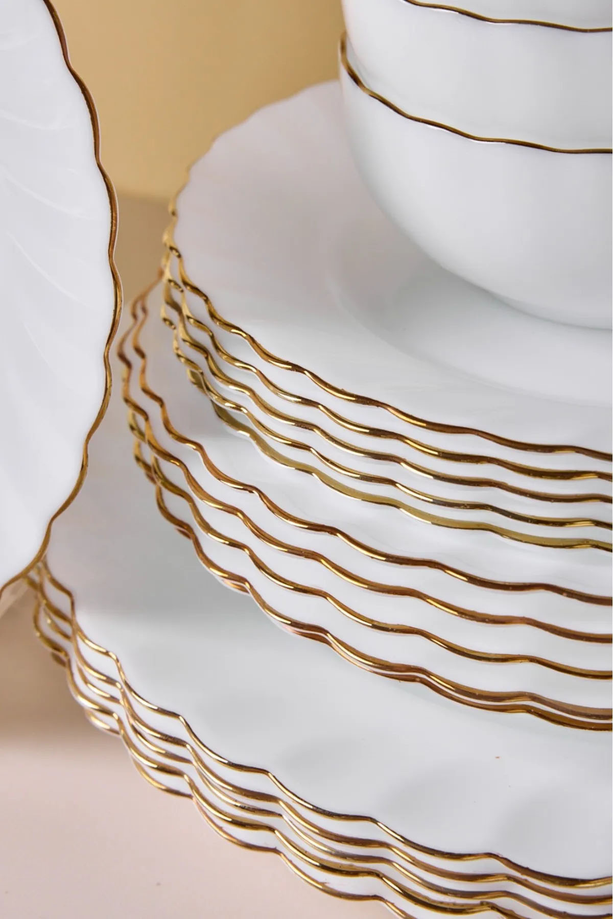 6 Adet Gold Yaldızlı Pasta Tabağı (19 cm) – Gold yaldızlı kenar detayları 6 Adet Gold Yaldızlı Servis Tabağı (26.75 cm) – Şık ve modern tasarım 6 Adet Gold Yaldızlı Yemek Tabağı (21.7 cm) – Sofranızda kusursuz uyum 6 Adet Gold Yaldızlı Çorba Kasesi (11.5 cm)