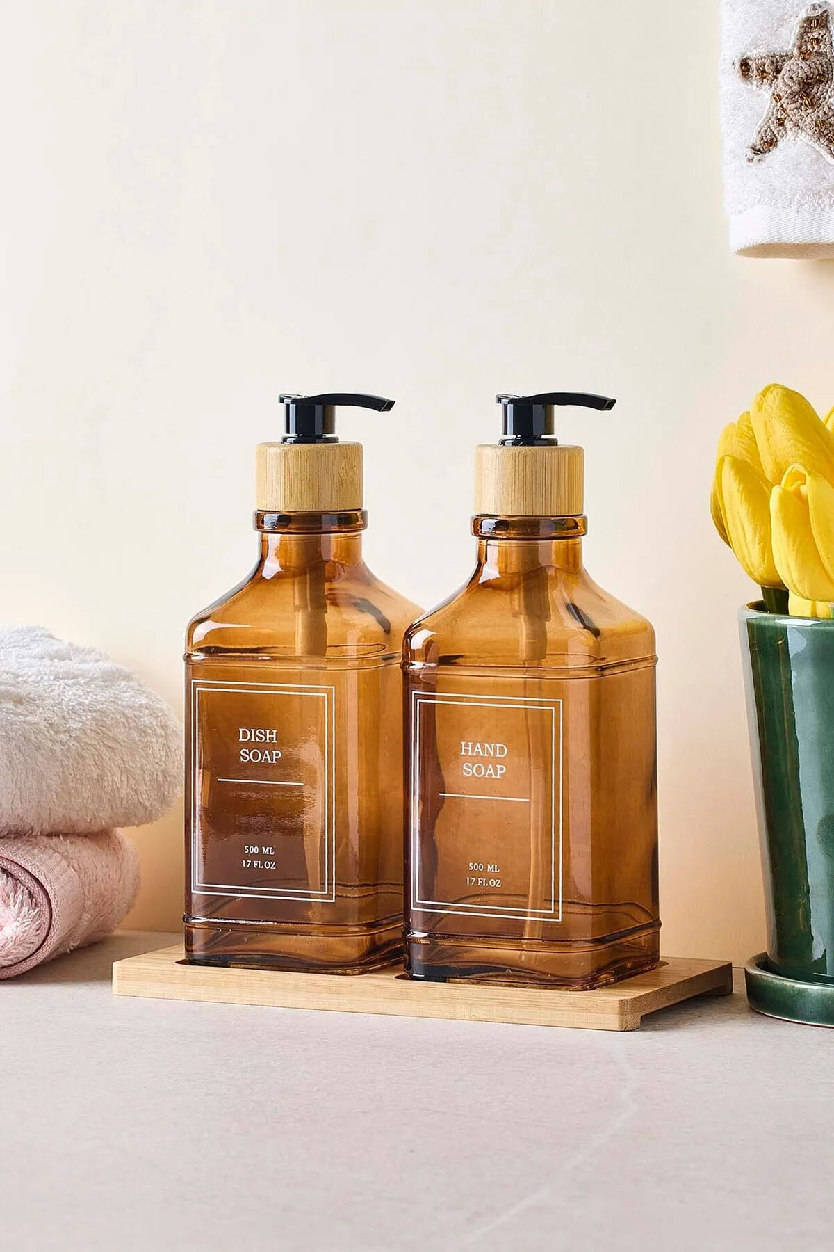 Amber cam şişeleriyle zarif bir görünüm sunan bu 2’li sıvı sabunluk seti, kullanışlı tepsisiyle banyonuza veya mutfağınıza şıklık katar. Her bir sabunluk, pratik kullanım için ideal boyutta olup, sıvı sabunlarınızı hijyenik ve kolay bir şekilde saklamanızı sağlar. Tepsi ise sabunlukların bir arada durmasını sağlayarak düzenli ve estetik bir alan yaratır.